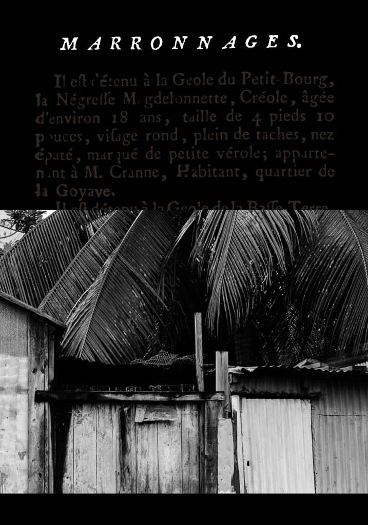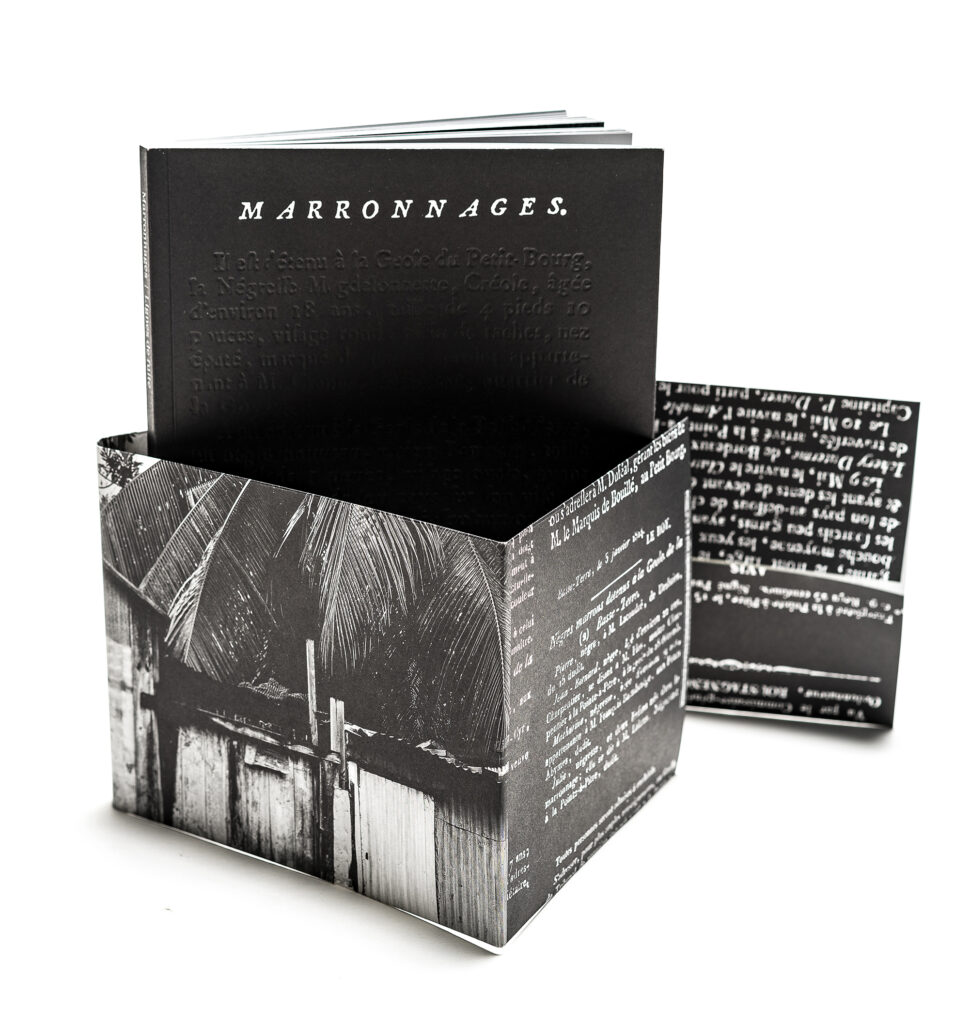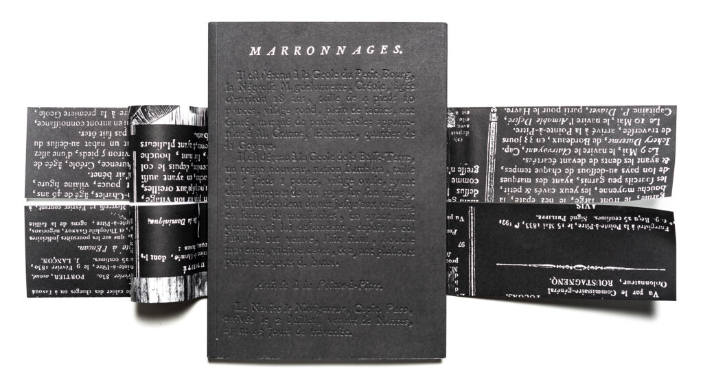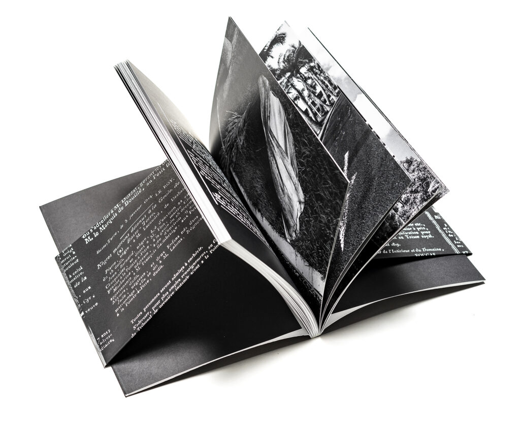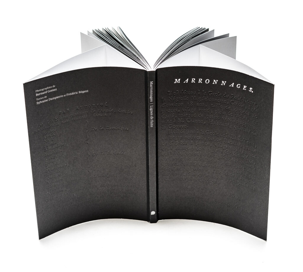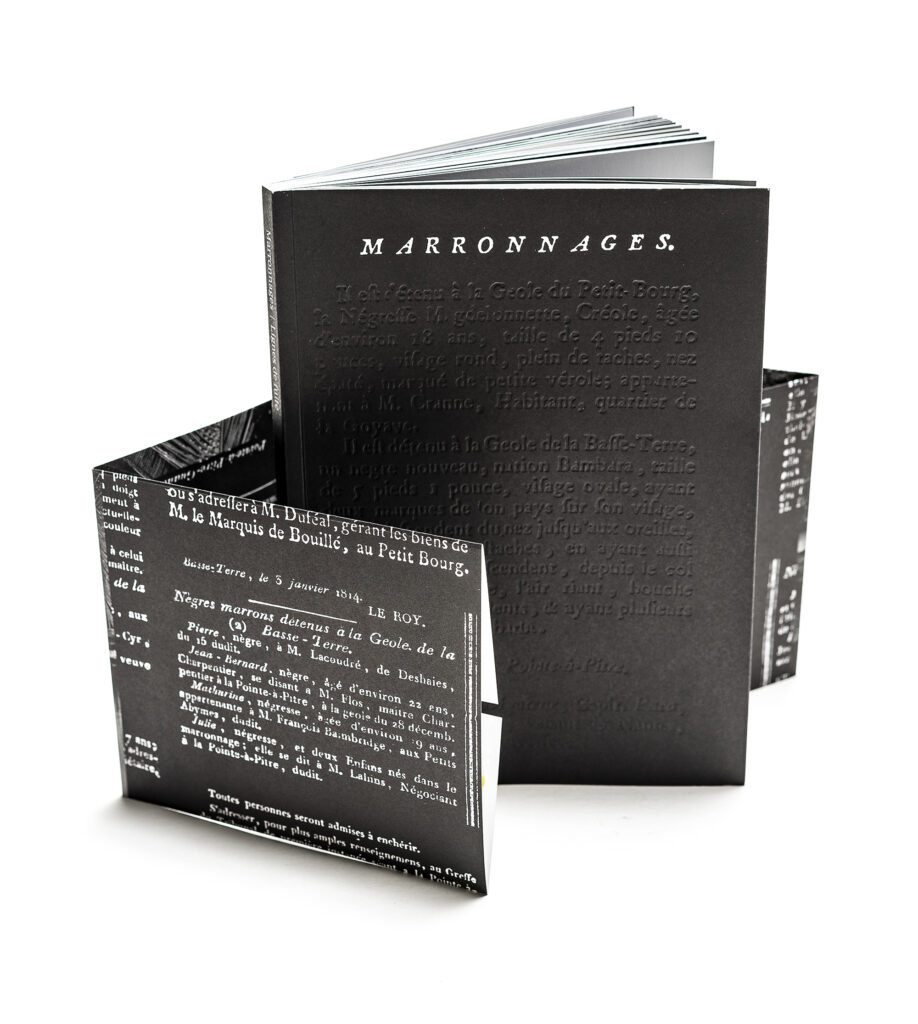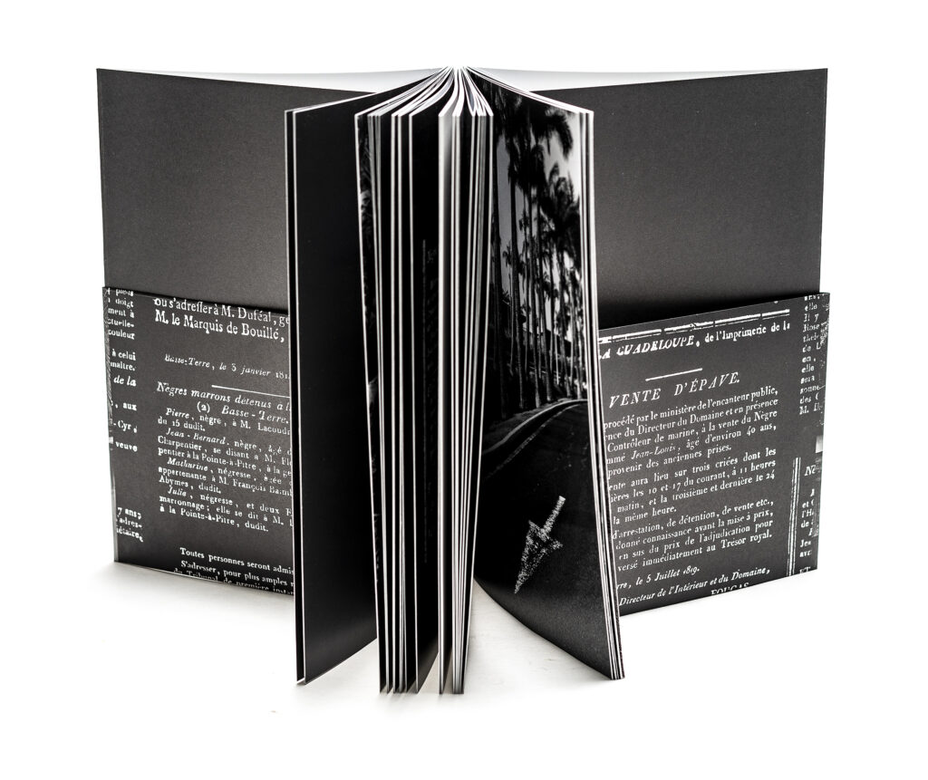 This book brings together a selection of notices seeking runaway slaves (notices of marronage) published in the Gazette de la Guadeloupe between 1788 and 1847. These announcements of attempted escapes and perilous getaways, published alongside other announcements (prices of coffee, sugar, and cotton), reinforce the everyday violence experienced by slaves in the 18th and 19th centuries through their banality. Bernard Gomez’s black-and-white photographs accompany this collection of archives, depicting the landscapes of Guadeloupe, which are like imprints, traces of harrowing stories… The wanted notices are reproduced in facsimile on black backgrounds.